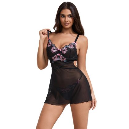 Camisón con tirantes y sujetador con realce, bordado flores en color negro Talla 2XL