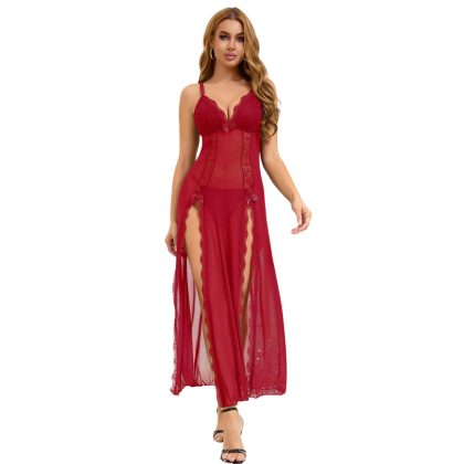 Camisón rojo sexy de malla con encaje y abertura larga – incluye tanga, Talla S