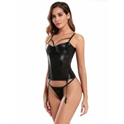 Corsé sexy con 10 huesos de plástico y costuras de cuero y encaje negro – incluye liguero y tanga, Talla M