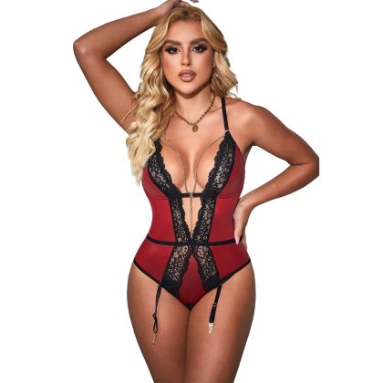 Body sexy rojo de encaje con liguero sin entrepierna Talla 2XL